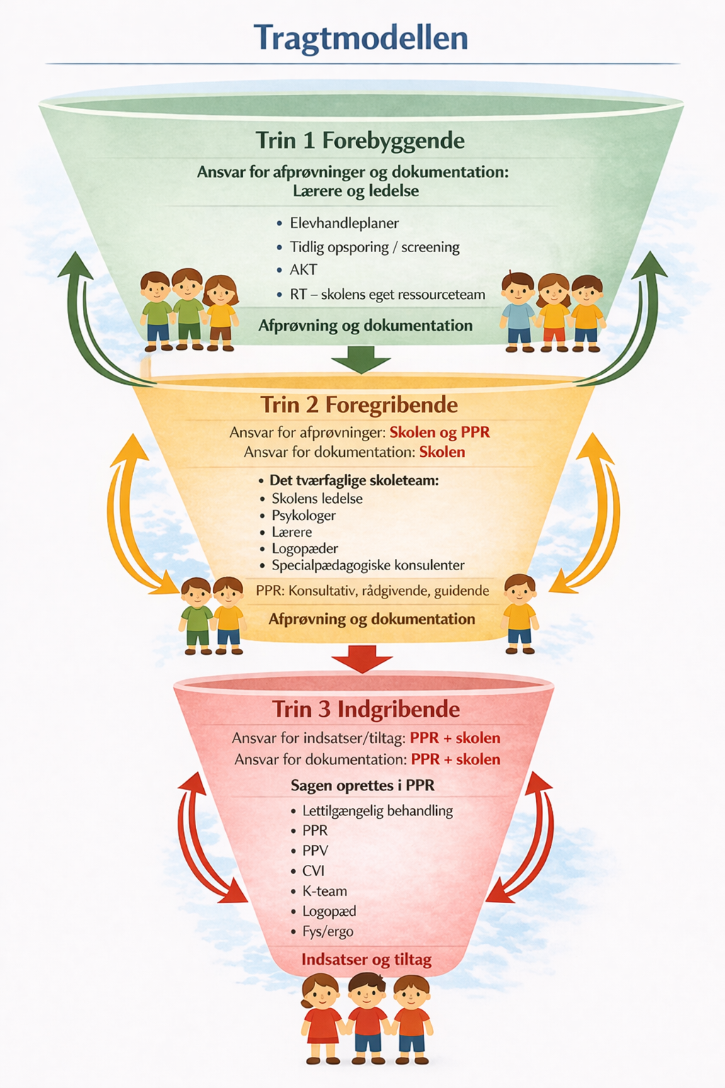 Arbejdet tager afsæt i Tragtmodellen, som understøtter tidlig opsporing og indsats gennem tre trin: